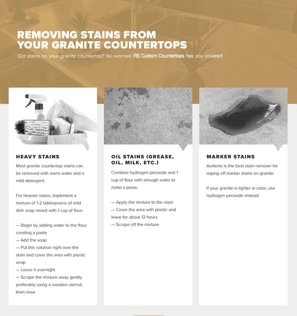 - Clean any oil or grease spills as soon as possible. Leaving greasy products on granite can penetrate into the stone over time.